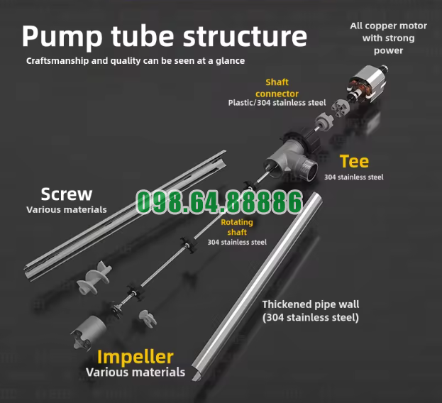 Trục quay là bộ phận truyền lực từ động cơ xuống cánh bơm. Trên Bơm điện hút chất đặc từ thùng phuy JDT-4000W-LQ, trục quay được làm từ inox 304, giúp tăng độ cứng, chịu tải tốt và hạn chế biến dạng khi làm việc lâu dài. Nhờ đó, lực truyền xuống cánh bơm được duy trì đều hơn, góp phần giữ máy hoạt động ổn định trong môi trường chất lỏng có độ nhớt cao.