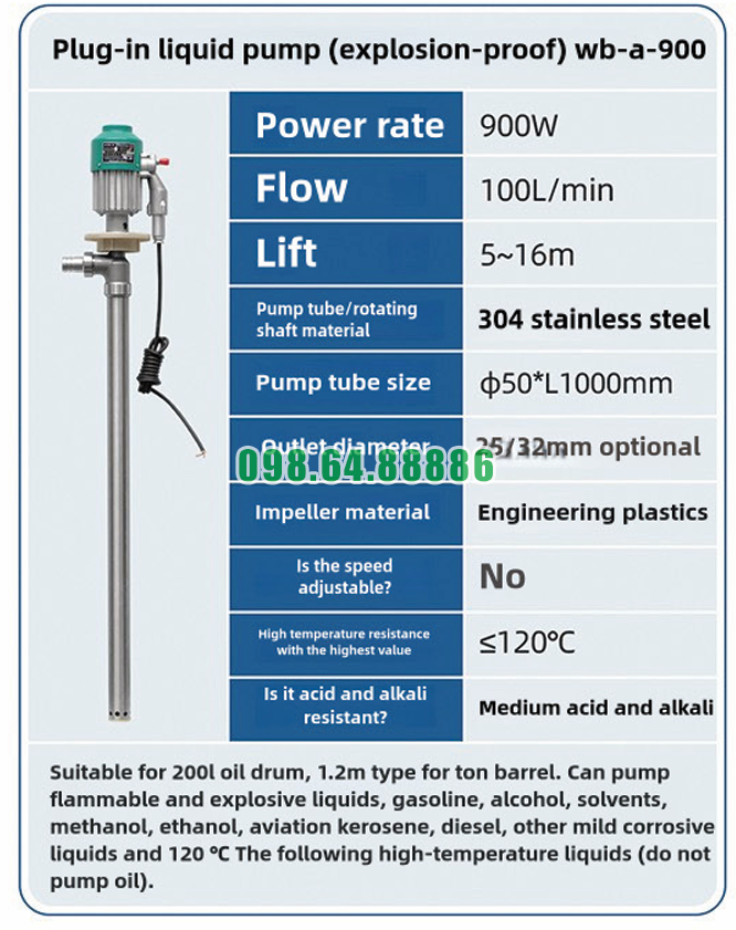 Để Máy bơm chất lỏng inox 304 chống cháy nổ WB-A-900 đạt hiệu suất cao, trước hết cần sử dụng đúng loại chất lỏng mà máy được thiết kế để bơm. Thiết bị phù hợp với các chất lỏng dễ cháy và dễ nổ như xăng, cồn, dung môi, methanol, ethanol, dầu hỏa hàng không, diesel, các chất lỏng ăn mòn nhẹ và chất lỏng có nhiệt độ dưới 120°C.