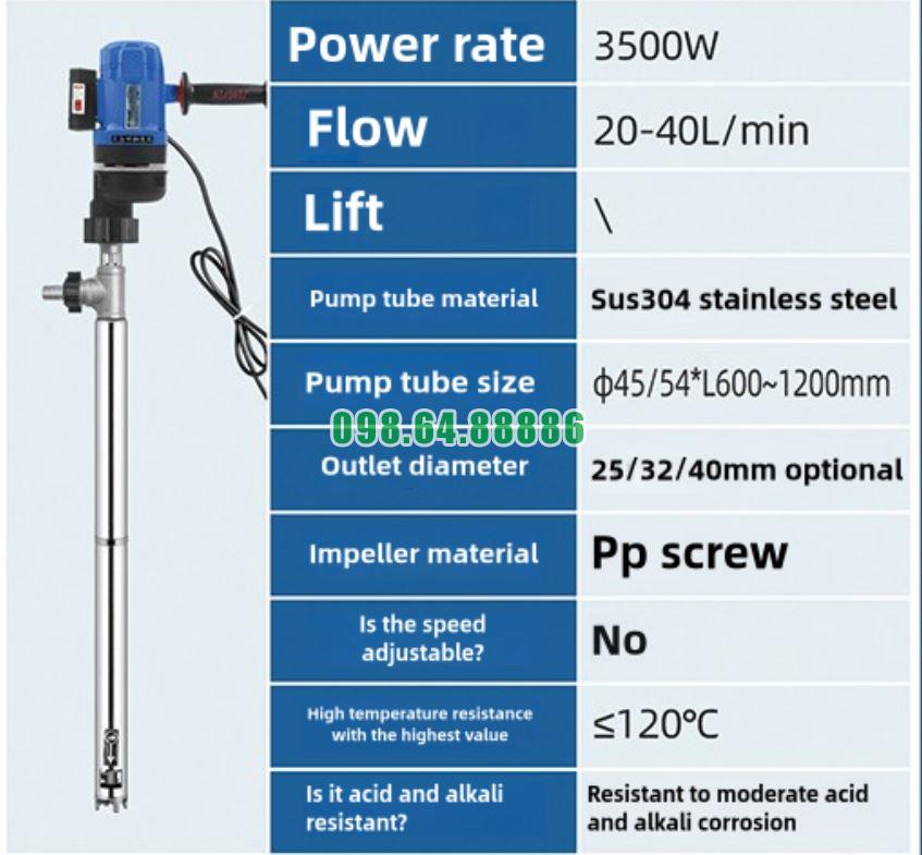 Máy bơm điện cầm tay hút thùng phuy JDT-3500W-LGG120 là giải pháp lý tưởng cho việc bơm thực phẩm dạng lỏng trong ngành sản xuất thực phẩm, nhờ vào công suất mạnh mẽ, khả năng làm việc với các chất lỏng có độ nhớt cao, và các tính năng vệ sinh dễ dàng. Máy bơm này giúp tăng hiệu quả sản xuất, tiết kiệm thời gian, bảo vệ chất lượng thực phẩm và đảm bảo an toàn vệ sinh trong suốt quá trình bơm.