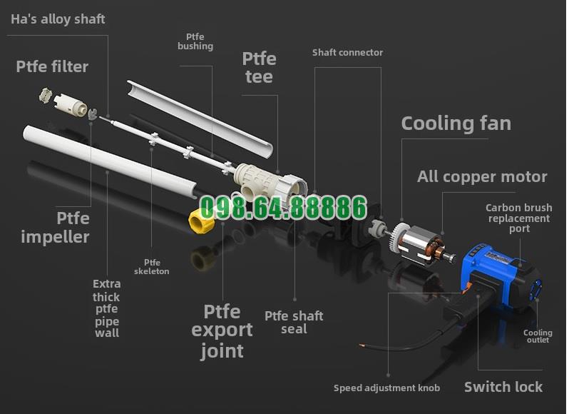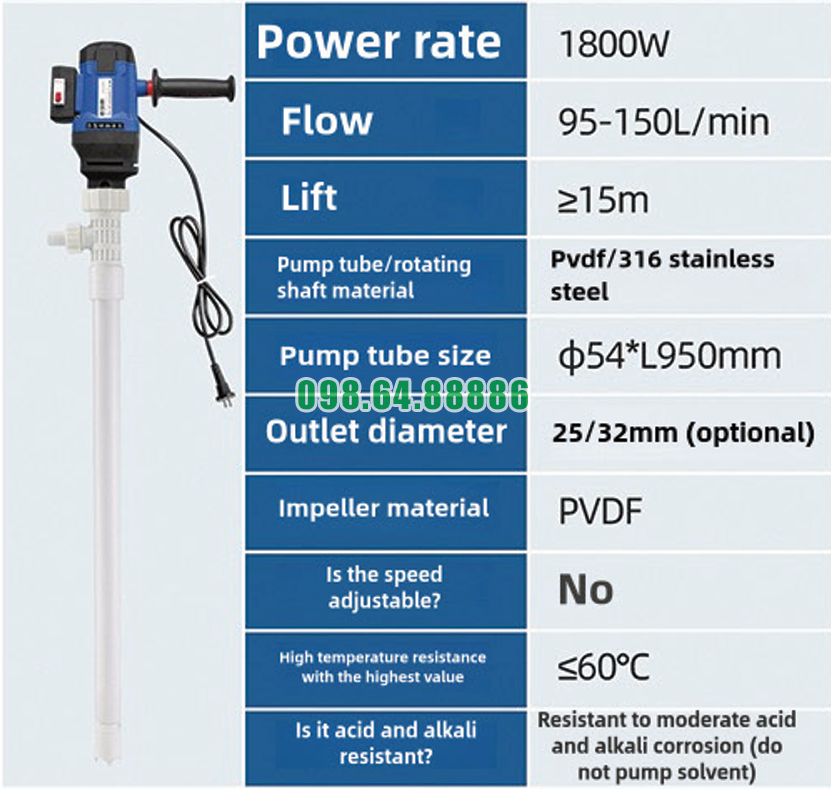 Một yếu tố quan trọng đảm bảo độ an toàn tuyệt đối khi dùng Máy bơm điện bơm chất lỏng thùng phuy JDT-1800W-PVDF là vật liệu PVDF được sử dụng cho ống bơm và cánh bơm.
