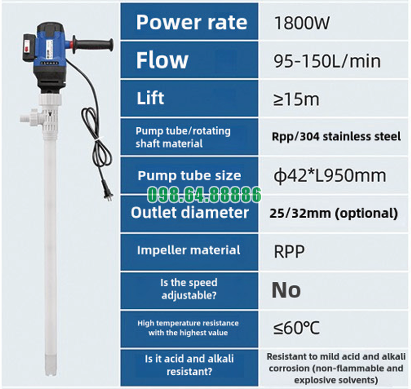 Nhờ độ bền cao và khả năng thích nghi tốt với nhiều môi trường làm việc, Máy bơm chất lỏng điện cắm điện JDT-1800W-RPP là lựa chọn đáng tin cậy cho các doanh nghiệp cần thiết bị bơm chất lỏng hiệu quả và bền bỉ.