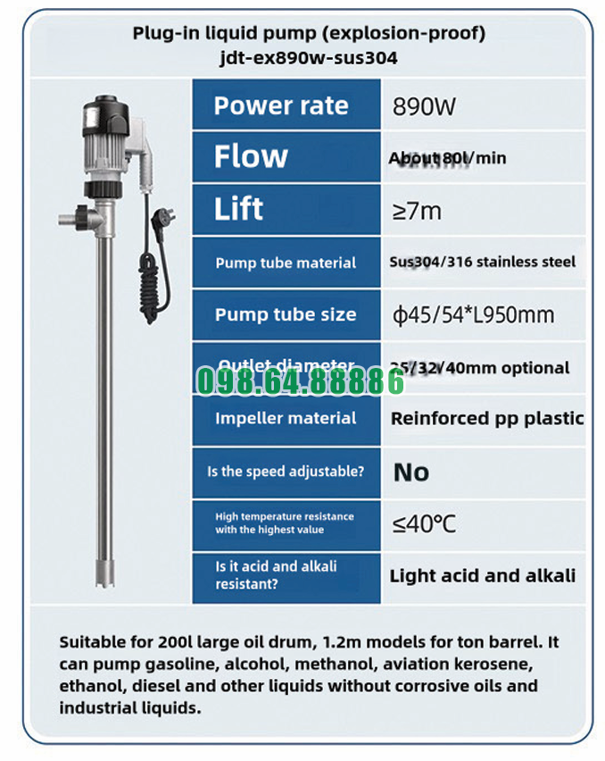 Máy bơm chất lỏng cắm trực tiếp chống cháy nổ JDT-EX890W-SUS304 có thể sử dụng để bơm các dung dịch như chất tẩy rửa nhẹ, dung môi pha loãng, hoặc các hóa chất xử lý bề mặt có tính axit/kiềm nhẹ.