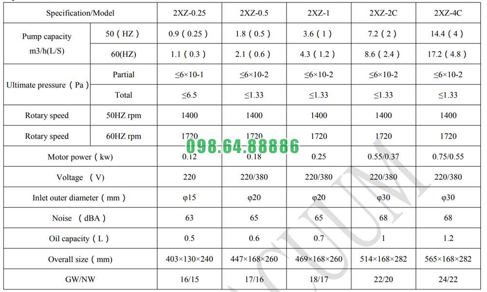 Bơm chân không bôi trơn dầu model 2XZ-2 lưu lượng 7.2 m³