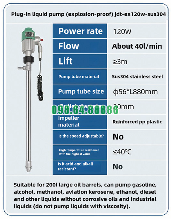 Giải pháp bơm Methanol tuyệt vời với Bơm chất lỏng cắm điện chống cháy nổ JDT-EX120W-SUS304 là lựa chọn đáng tin cậy cho các đơn vị cần một thiết bị bơm an toàn, ổn định và dễ sử dụng. Với thiết kế chống cháy nổ, vật liệu bền bỉ, lưu lượng phù hợp và khả năng ứng dụng thực tế cao, sản phẩm đáp ứng tốt yêu cầu bơm Methanol trong nhiều môi trường công nghiệp. Đây là giải pháp hiệu quả giúp nâng cao năng suất làm việc đồng thời tăng độ an toàn trong quá trình sang chiết.