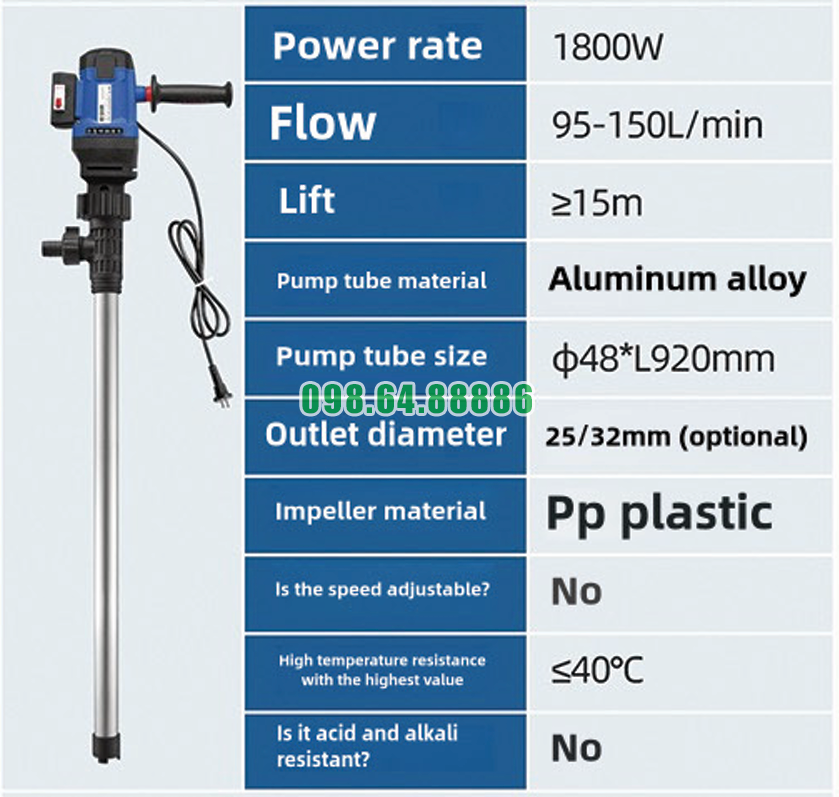 Trong thực tế, nhiều loại chất lỏng được lưu trữ hoặc sử dụng ở nhiệt độ cao. Bơm điện thùng phuy cao cấp JDT-1800W-L92 vẫn đảm bảo khả năng hút và bơm ổn định trong những điều kiện này, không xảy ra hiện tượng hụt lực hoặc gián đoạn dòng chảy do ảnh hưởng của nhiệt.