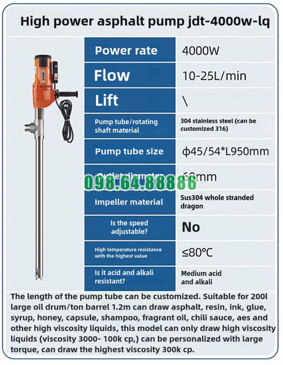 Bơm điện hút chất đặc từ thùng phuy JDT-4000W-LQ không phải dòng bơm đa năng cho mọi loại chất lỏng, mà được thiết kế tập trung cho môi chất có độ nhớt từ 3000–100.000 cps, có thể tùy chỉnh tới 300.000 cps. Chính tính chuyên dụng này giúp máy đạt độ ổn định cao hơn khi bơm chất đặc, vì toàn bộ cấu tạo đều hướng tới việc xử lý loại môi chất có lực cản lớn.