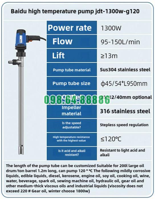 Trong xưởng cơ khí, dầu nóng và dung dịch gia nhiệt được sử dụng thường xuyên cho bôi trơn, gia công và xử lý nhiệt. Bơm thùng phuy nhiệt độ cao JDT-1300W-G120 nếu được ứng dụng đúng cách sẽ giúp tăng hiệu suất, đảm bảo an toàn và giảm chi phí vận hành.