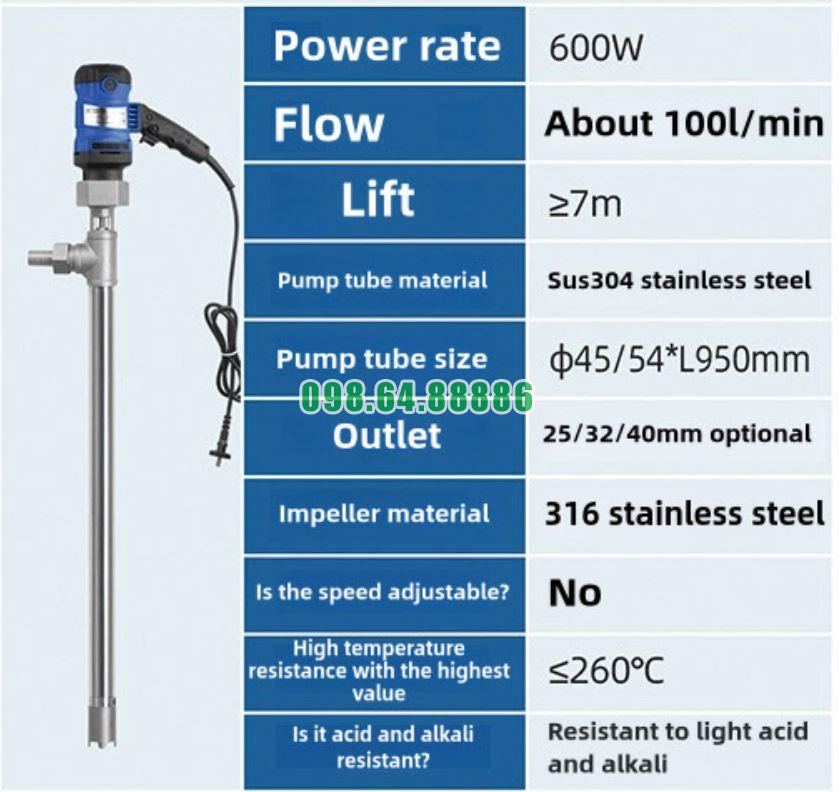 Bơm thùng phuy inox chịu nhiệt JDT-600W-G260