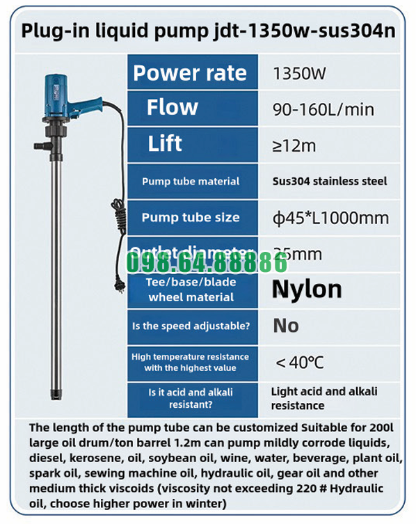 Máy bơm cắm điện cho thùng chứa dầu nhớt JDT-1350W-SUS304N