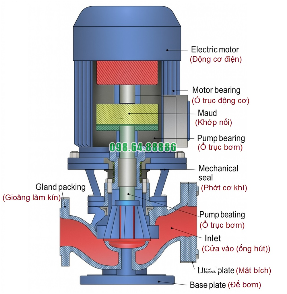 Thiết kế: dạng trụ đứng, gắn trực tiếp vào đế bơm, có cửa hút và cửa xả bố trí theo tiêu chuẩn đường ống.