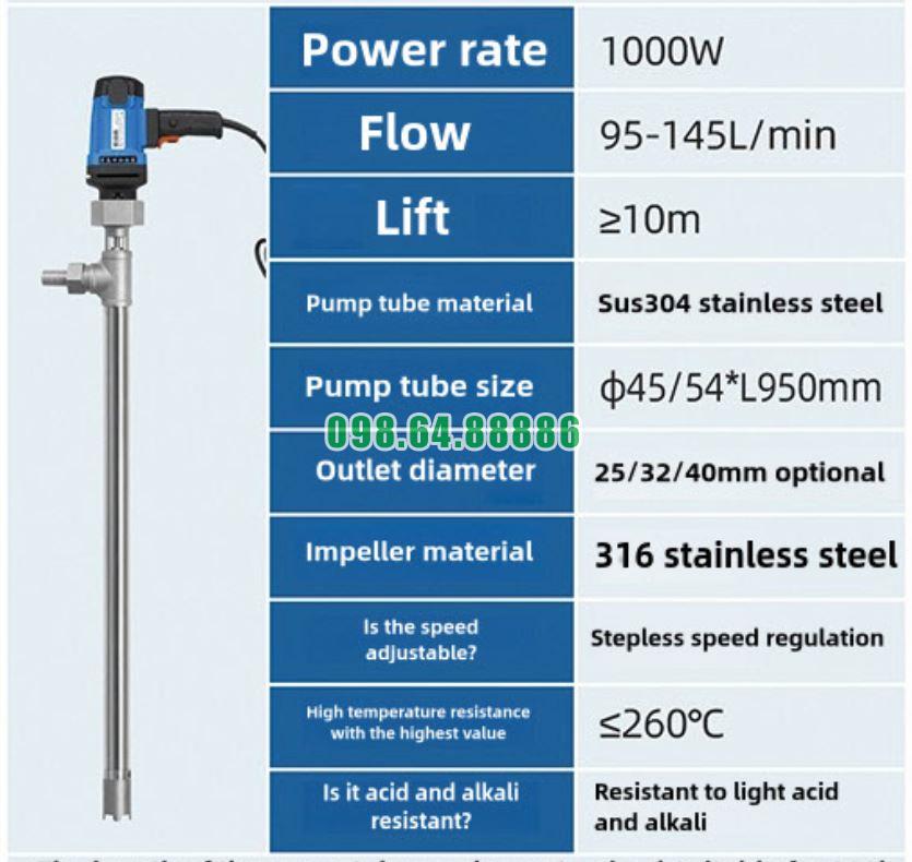 Với vật liệu inox cao cấp, motor bền bỉ và cấu trúc cơ khí chính xác, Máy bơm thùng phuy inox SUS304/316 JDT-1000W-G260 là thiết bị có tuổi thọ cao, vận hành ổn định và ít hỏng hóc, mang lại giá trị sử dụng lâu dài cho các doanh nghiệp trong ngành hóa chất, dung môi và công nghiệp thực phẩm.
